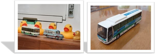 まずはアヒル隊と奈良交通のバスでして。実はアヒル隊は昔、子どもの頃に実家にアヒルがおりまして。「ガー子っ」てよぶと「ガーッ」、「ガーッ」といってついてきたので愛着がありまして。大人げもなく買って、お風呂にも浮かせております。