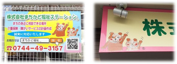 まちかど福祉ステーションも開設して早や10年。まちかどのキャラクターロゴも決まり、これを機会に傷んでいたロードサイドの看板をかけ替えました。事務所上の看板にもイラストが登場。歩道を歩くお年寄りや通学する小学生の皆さんからは、立ち止まって見て頂いたり、「こんなところに絵が描いてある」とお声掛けを頂くなど、より、目を留めて頂ける構成となりました。
